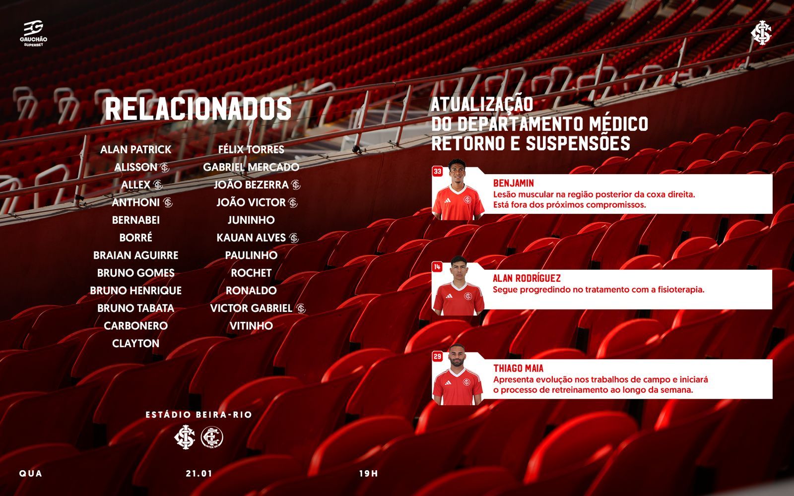 A nominata alvirrubra conta com os retornos de Alan Patrick, Borré, Carbonero e Rochet. Além disso, Paulinho e Félix Torres, reforços do Clube do Povo, estão relacionados para o embate. Confira abaixo a lista completa: