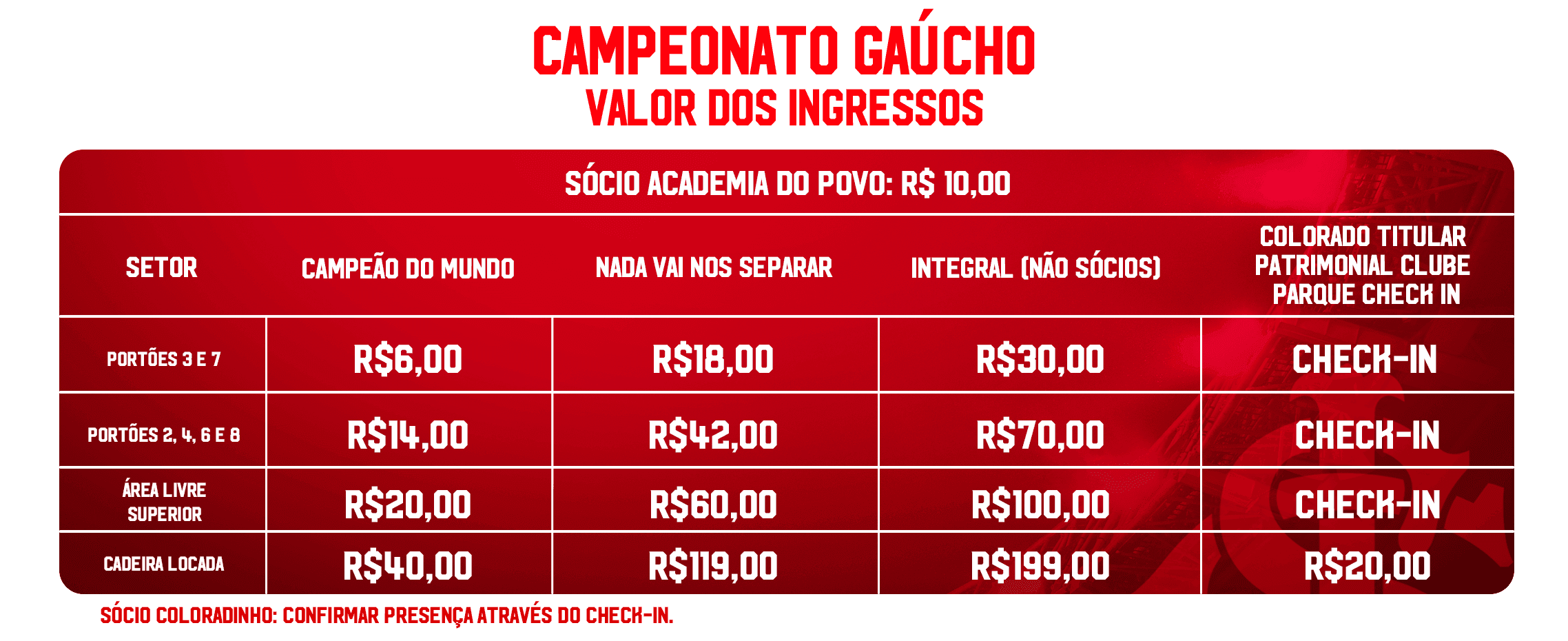Para esta temporada, o Clube adota uma nova política de precificação para os jogos do estadual com a retomada da diferenciação de valores entre as arquibancadas inferior e superior. A medida amplia as opções para os torcedores e torna o acesso ao Beira-Rio ainda mais democrático.