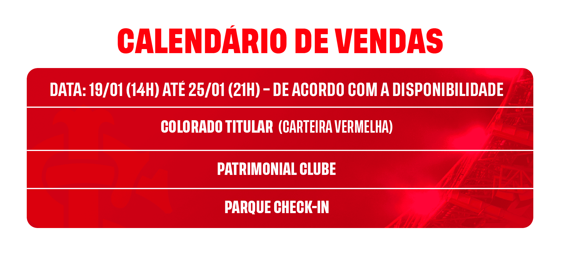A Central de Atendimento ao Sócio (CAS) funciona de segunda a sexta-feira, das 8h30 às 17h30. No dia do jogo, a CAS estará aberta das 10h até o início da partida.