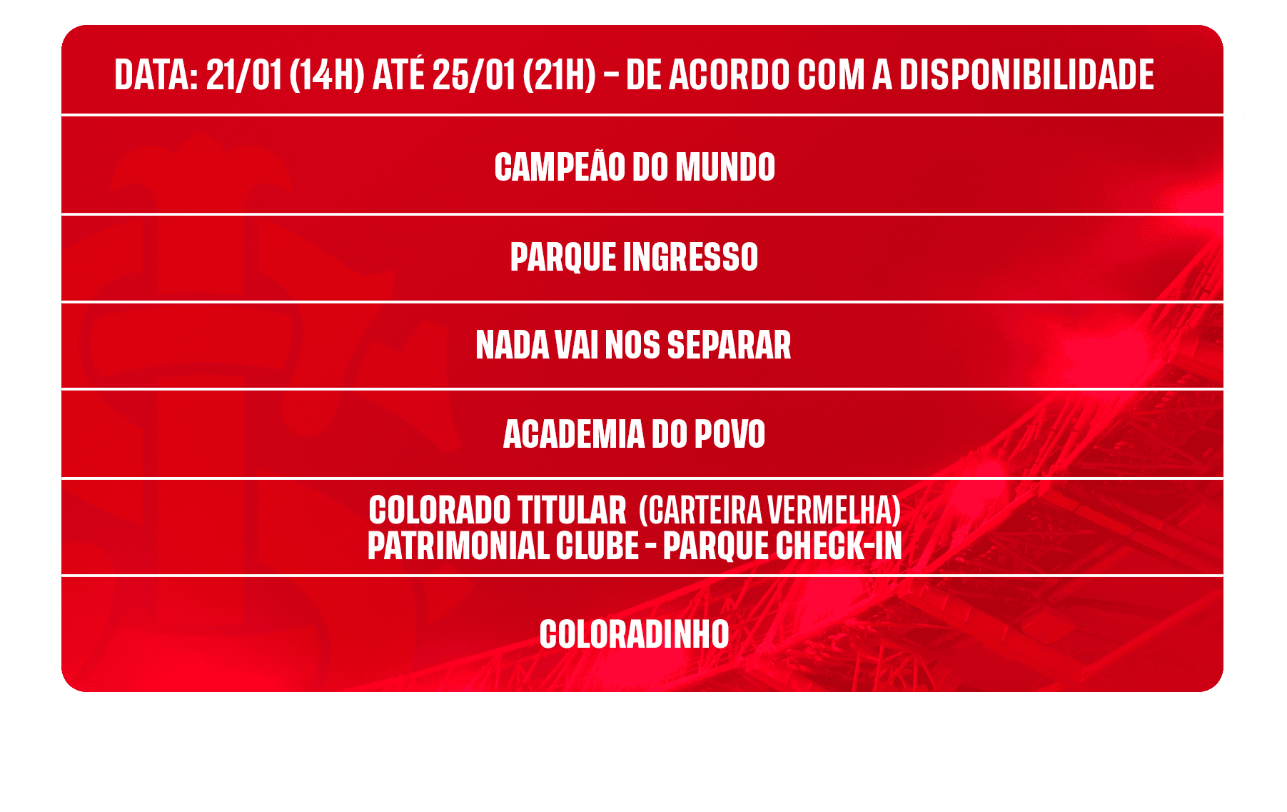 1 – O acesso ao Estádio será realizado diretamente nos portões selecionados no Check-In ou ingresso.